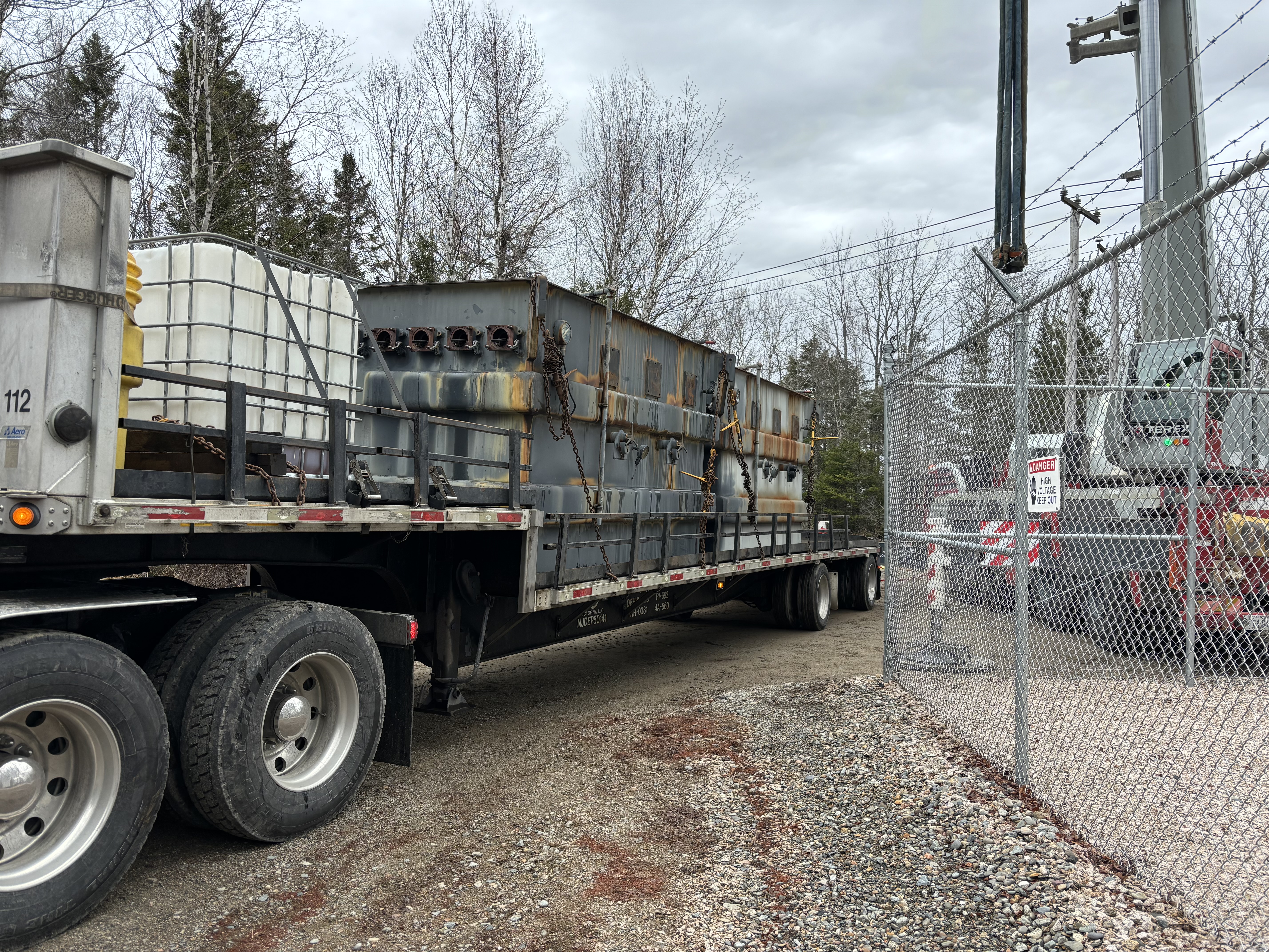 Substation transformers loaded onto trailers for proper disposal.